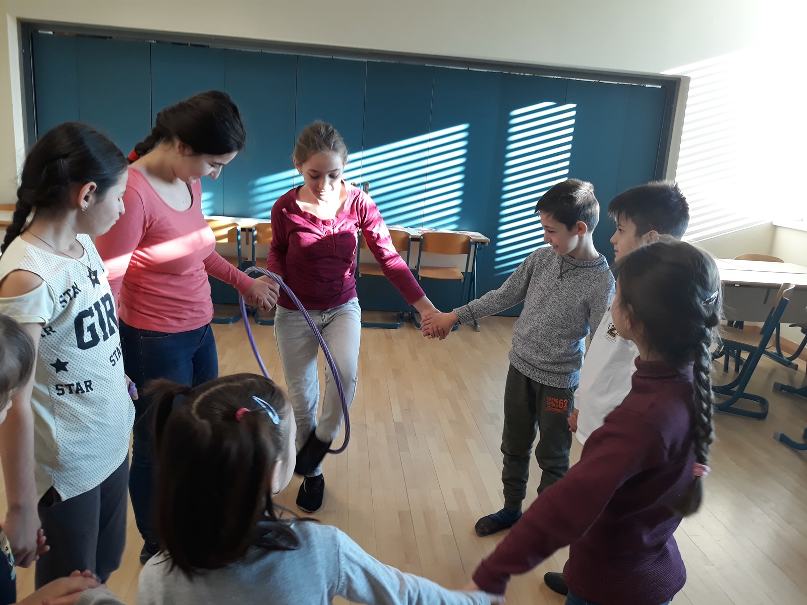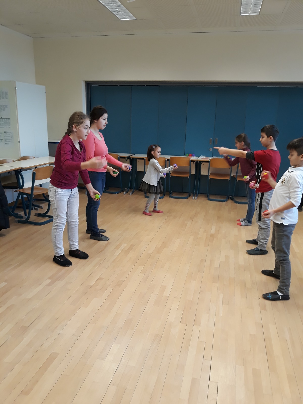 Z elementi cirkuške pedagogike smo se najprej v krogu z žogico spoznali. Različne igre v krogu so od sodelujočih zahtevale veliko vzajemnosti in koncentracije. Sledile so vaje z rutkami. Z njimi smo utrjevali besedišče na dano črko ali temo. Celotna skupina se je morala uskladiti, kar nam je tudi uspelo. Poskusili smo tudi žonglirati z rutkami. Nekaterim je šlo, drugi pa so že nestrpno pogledovali žogice. Vsak učenec si je izdelal svoje žonglerske žogice. Tudi takrat je bilo lažje, če smo sodelovali in si pomagali. Ko je vsak imel tri žogice, smo se lotili vaj žongliranja v parih, najprej sede, nato še stoje. Sledilo je samostojno žongliranje. Veliko bomo še trenirali, smo si obljubili, saj so žogice na začetku kar letele po tleh.