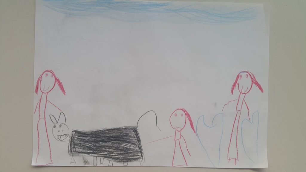 Veliko priseljencev je sprva izražalo strah in nezaupanje do psa, saj so pridobili slabe izkušnje s psi na poti do Evrope, vendar se je ta odpor do psa počasi mehčal, zlasti pri otrocih, ki so proti koncu našega obiska veselo sprehajali Timija na vrvici po okolici doma. Odrasle je zbodlo, kako to, da ima v Evropi pes potni list, oni pa ne, vendar se bodo po besedah vodje doma na vse to morali navaditi. Na koncu smo obiskali še vrtec Črnuče, kjer nas je čakala velika množica otrok, med njimi tudi deklica iz Iraka, ki se je postopoma opogumljala in sproščala v družbi psa. Po obisku so otroci narisali, kar so doživeli. Tole je risba deklice priseljenke: