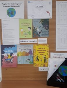 Na naslednjih dveh slikah si lahko ogledate kotiček za informiranje na temo projekta Pogled čez meje migracij in glede medkulturnosti na OŠ Rodica.